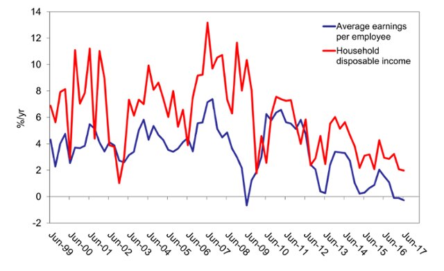 Between the two survey periods, household disposable income has continued a downward trend that commenced in 2008 with the onset of the global financial crisis. It is currently at just two per cent compared to above four per cent annual growth achieved between 2003 and 2007.
